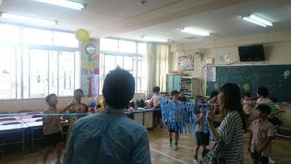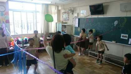 教室に2つコートを作り、風船バレーをします。5人ほどのお店番の子と対決します。たとえ1人で参加しても人数はそのままです!手加減なしで風船を打ち込んでくるので、大人も必死になり、楽しそうでした。