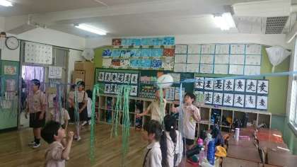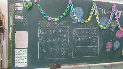 こちらの風船バレーは、教室全体を1つのコートにしていました。風船を追いかけ回しながらナイスプレーが生まれています。ランキングには10班が1位と書いてありました。最終的にはどの班が1位だったのか気になるところです。