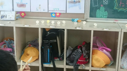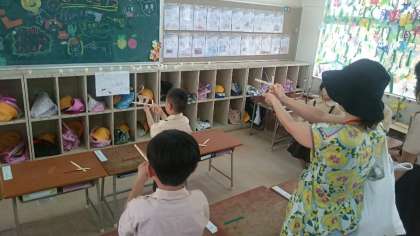 11・12班は昔懐かしの輪ゴム鉄砲で射的のお店を出しました。夜店や温泉で見かけるあの射的。このお店は的が牛乳キャップで作られていました。とても小さい的なので、当てるのはなかなか難しそうです。