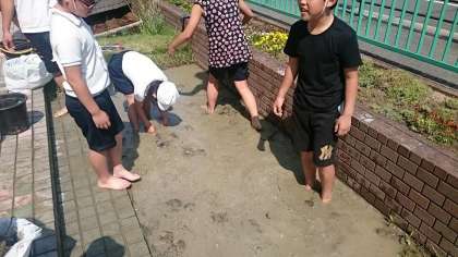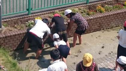 5年生がビオトープの田んぼで、田植えにむけての準備をしました。去年の稲の根が残っていたので、それを引き抜きました。はだしで泥の中に入ると、みんな大きな歓声?をあげていました。また、泥の感触が気持ちいい、と言っていました。苗を植えるのが楽しみですね。