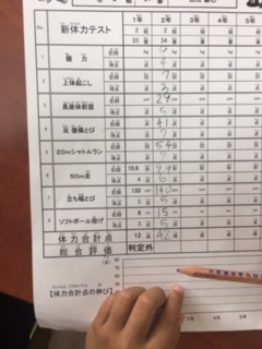今年の自分の記録を昨年度と比べたり、どれだけ得点できたか調べたりしました。得意な運動、苦手な分野が少しわかってきたので、普段の体育の授業や遊びの中でも意識して取り組むともっと体力や運動能力が伸びていくでしょう。記録は、6年間毎年つけて、残していきます。ガンバレ、大宮っ子!!