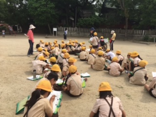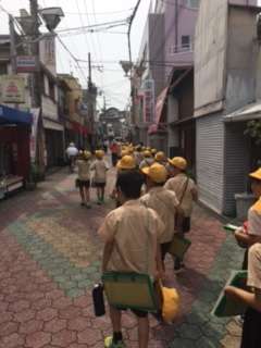 商店街を通り、大宮神社、大宮中公園などを回りました。普段見慣れているつもりでも改めて見ると、新しい発見もありました。地図記号を確認しながら白地図に記入していきました。