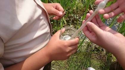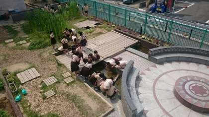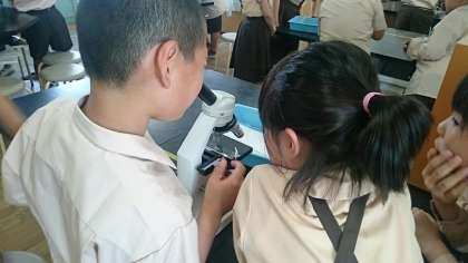 5年生がビオトープの池の水を採取していました。尋ねると、理科の時間で顕微鏡を使って微生物を見ると言うので、理科室に行きました。