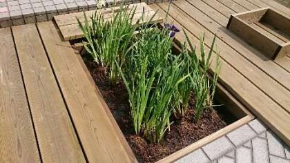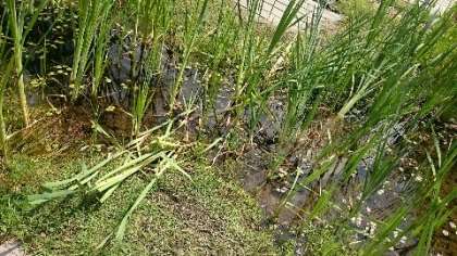 ビオトープの池のガマや菖蒲が横倒しになっていました。凄まじい天候だったことがうかがえます。すぐに倒れた茎を戻しました。今後も元気に育つことを祈るばかりです。