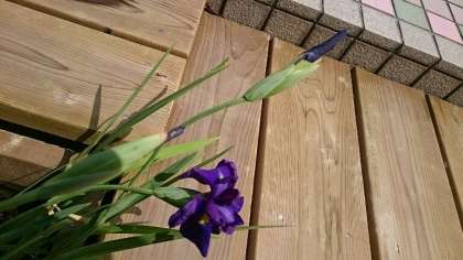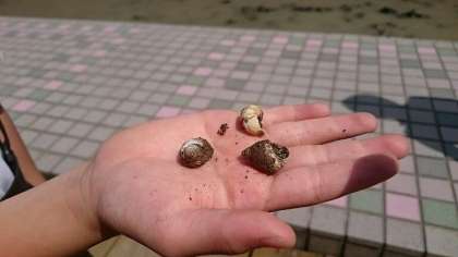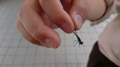 貝殻、咲きかけの菖蒲の花のつぼみ、そしてイトトンボ(どうやって捕まえたのでしょうか?捕まえた指を離すと元気に飛んで行きました。もはやトンボ捕り名人!)。