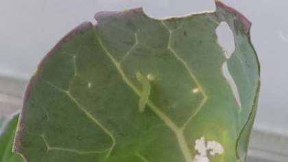 3年生の教室前に、キャベツが立てて置かれています。キャベツの葉をよく見てみると…、小さいアオムシが見つかりました。モリモリとキャベツを食べています。いっぱい食べて脱皮をし、大きく育ってほしいです。これから成長の様子を観察するのが楽しみです。