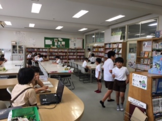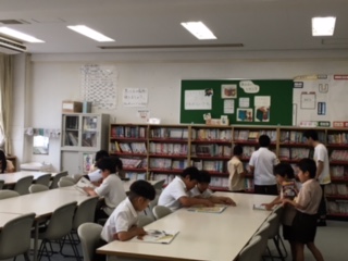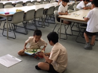 雨なので、図書館で本を読みに来ています。紙芝居も自由に読むことができます。もうすぐ新しい図書も入る予定です。楽しみにしていてくださいね。