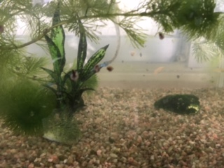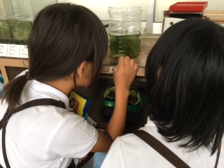 教室前の水槽には、ヒメダカがいます。卵を産んだので、小さいペットボトルの水槽に移し替えて観察しています。小さな赤ちゃんメダカが何匹もいました!