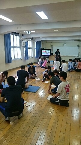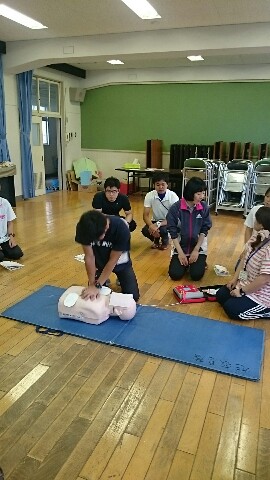 放課後に救急救命講習会を行いました。旭消防署の救急隊の方々にご指導を受け、心臓マッサージと人工呼吸の方法、AEDの取り扱い方を勉強しました。その後は、実習を行いました。