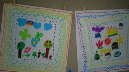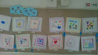 東校舎1階の廊下に1年生の作品が掲示されています。「すてきなはんかち」というテーマでパスを使って絵や模様を描きました。ユニークでカラフルなはんかちがたくさんあるようです。ぜひ、日曜参観でご覧ください。