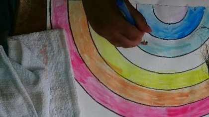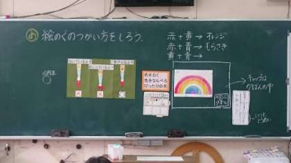 今日のテーマは「絵のぐのつかい方をしろう」です。はじめに知っておきたい道具の使い方、色の作り方、水の使い方、塗り方などなど。虹の色を塗りながら子どもたちはチャレンジしていました。とてもていねいに塗ることができました。