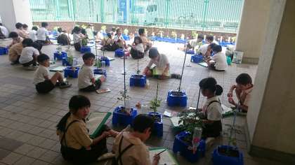 ピロティで2年生が、自分たちが育てている野菜を観察していました。
