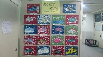 4年生の教室前の廊下に絵が飾られています。「よく見てかこう」をテーマに、運動靴をていねいに描きました。