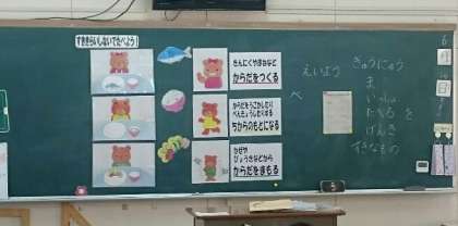 「鼻をつまむ」「一番最初に食べる」「一気に食べる」「少しずつ食べる」「何も考えずに食べる」など、1年生なりに一生懸命考えて、なるほど!と思う意見がいっぱい出ました。特に多かったものが「好きなものと食べる」でした。すてきだなと思ったのが、「みんなで食べる」でした。さあ、今日からすききらいしないで食べましょう!