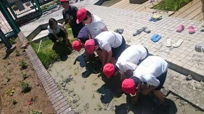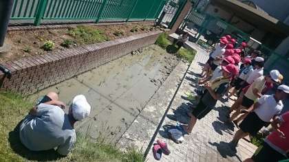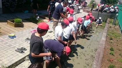 いよいよ今日が田植えの日。5年生は社会で農業(米作り)について学習し、ビオトープの田んぼを田植えができる状態まで準備してきました。そして今日、JAの方をゲストティーチャーに招いて、田植えを行いました。