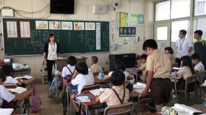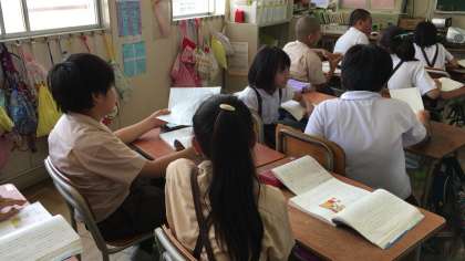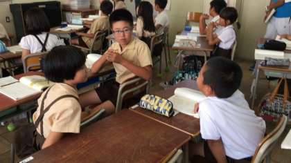 大体のあらすじをつかんだ後、立て札の違いに気づいた感想から、どこがどんな風に違うか、ペアや、グループで交流し、発表しました。語感の違いを感じている子どもたち。今後何故立て札が変わったのか、読みとったり、物語の山場が面白いお話を紹介したりしあいます。