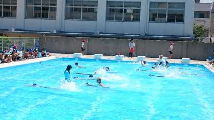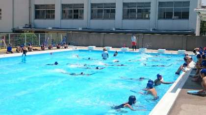 晴れ空で気温が上がり、プール水泳には絶好のコンディション。3年生が気持ちよく泳ぎました。ふし浮き、バタ足と基本の動作を練習しました。
