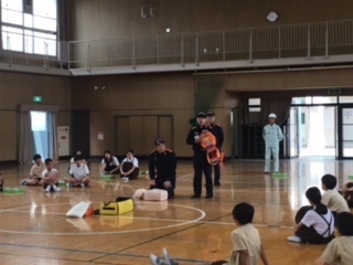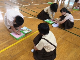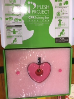 消防署や、地域の防災リーダーの方に教えていただき、胸骨圧迫の仕方やAEDの使い方などについて体験しました。2人1組で、ハート型の模型を使って実習です。1分間に150回位圧迫をしないといけません。初めはなかなかうまくできませんでした。ペアで回数を数えてアドバイスをし合いました。
