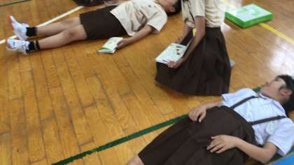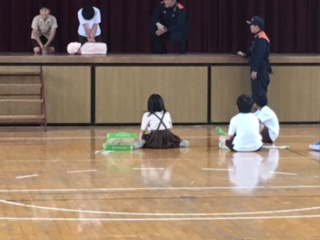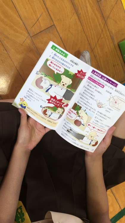 何回も練習をするうちに体重をかけてやると良いことがわかり、疲れず、しっかりと胸骨圧迫ができるようになりました。人が倒れているのを見つけたら、まず呼吸をしているか確認します。ペアで仰向きに寝て、どこが動いているか確認し合いました。講習会に参加した6年生は、防災リーダーとして、これから、もしもの時に活躍してくれることを期待します。