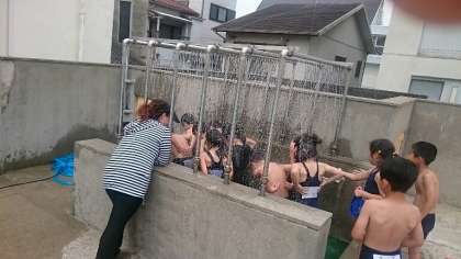 先生との掛け合いで声を出しながら、シャワーの中で体をこすります。だんだん水に慣れてきました。