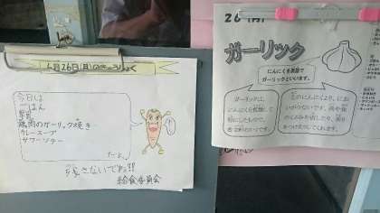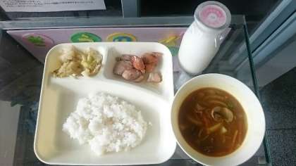 今日の給食の献立は牛乳、ごはん、カレースープ、鶏肉のガーリック焼き、サワーソテーでした。ガーリックとカレースープのスパイスが食欲をそそりました。暑い日にしっかり食べて汗を流せました。