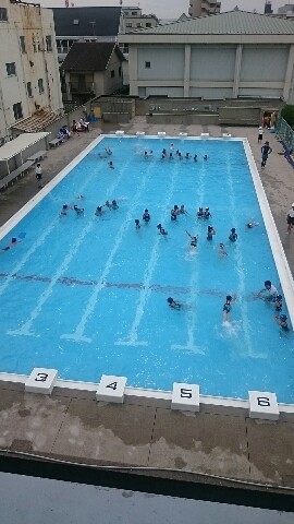 4年生がプールでの自由練習に取り組んでいます。今日の授業で学んだことを思い出しながら練習する子がいます。友だちと競い合って泳ぎ回る子もいます。どの子もみんな、本当に楽しそうです。