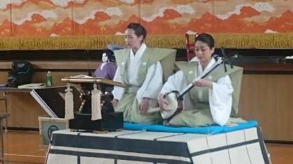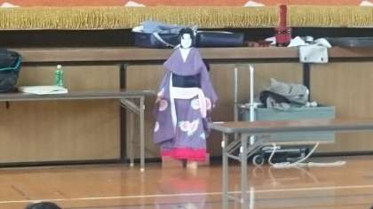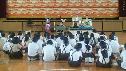 はじめに講堂で三味線と太夫の語りを鑑賞しました。日本古来の楽器の音色にのせて、独特の節回しと声色で口上が語られます。間合い、強弱の工夫でどんどん引き込まれます。昔の言葉遣いを聞き取るのは難しいですが、台本を配られているので、5年生も字を追いながら聞き入っていました。