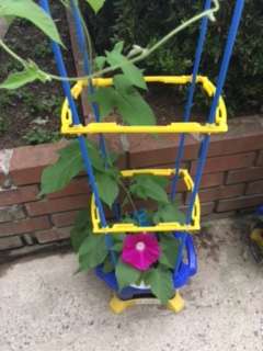 アサガオのツルがぐんぐん伸びてきました。きれいな花もいくつか咲いています!!