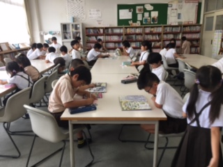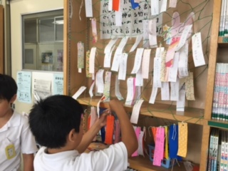 雨が降っていたので、図書館は大にぎわい。水曜日は、大阪工業大学の学生ボランティアさんとコーディネートの先生が応援に入ってくださいます。思い思いの本を読んで楽しみました。願い事の短冊にも、「もっと本が好きになりますように」と書いてありました。子どもたちがワクワク夢中になれる本をたくさん揃えたいと思っています。