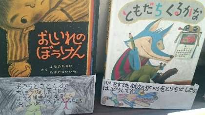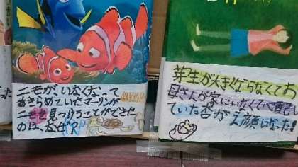 4年生が国語で本の帯を作りました。物語を読んであらすじをつかみ、おすすめの本として帯にメッセージを書きます。