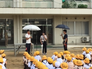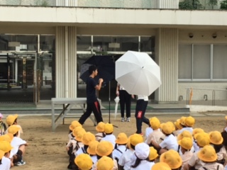 「江戸しぐさ」の一つ、「傘かしげ」について、F先生とK先生に実演してもらいながら、話をしました。雨の日に傘をさしてすれ違う時、ちょっと傘を傾けると、相手にぶつからず、濡れなくてすみます。ちょっとした心遣いで気持ちよく過ごせるという江戸時代のマナー、心配りの話です。皆さんは、道でどのようにされていますか?