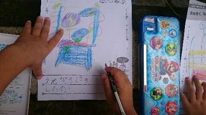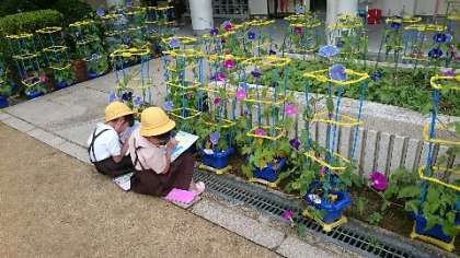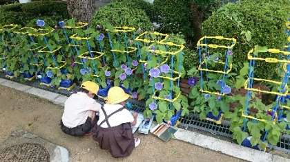 アサガオの花がたくさん開いています。1年生が大喜びで観察しています。ていねいに記録することができています。