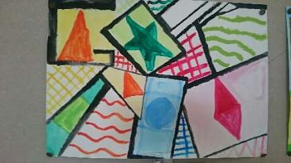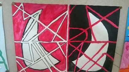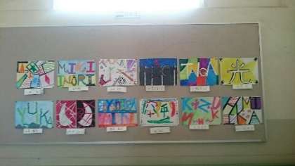 6年生の階段掲示は図画工作で取り組んだ「名前アート」です。一人一人のデザインのアイデアは全然ちがいます!それぞれの意図や工夫を感じながら観賞すると全然飽きません。おもしろいです。