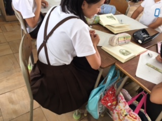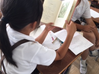 発展として、自分が選んだ本の中から、山場を中心に友達に紹介する学習をしています。ストーリーを一枚の紙にまとめて紹介文を作っています。山場がわかりやすい話とそうでないものとあり、なかなか難しく、考えながらまとめていました。