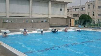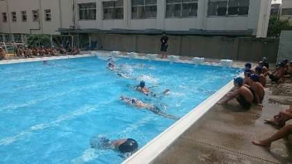 今日は6年生の1学期最後のプール水泳です。平泳ぎを集中して練習しました。手のかき方、頭の入水のしかたなど、フォームが美しい子を手本にして繰り返し練習しました。