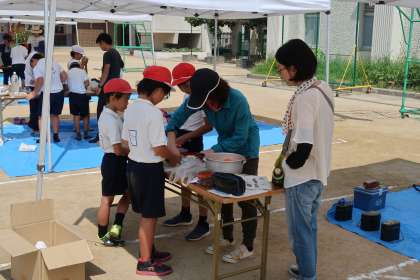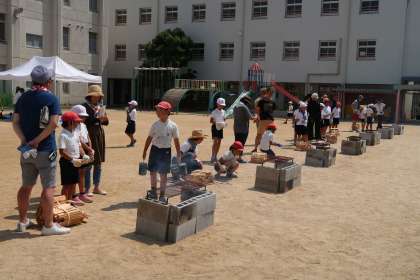 開会式を行い、初めの活動はカレー作りです。それぞれグループに分かれ、カレー作り開始です。かまどを作って、火を起こすチーム、米を洗ったり野菜を切ったりして、ごはんやカレーの準備をするチーム、保護者やPTAのみなさん、先生に教えてもらいながら、みんな一生懸命に取り組んでいます。