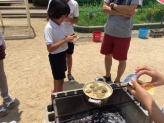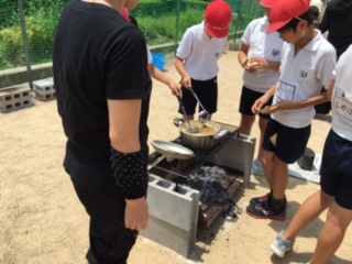 運動場のかまどからいい匂いが。子どもたちは、カレーのルーを入れて最後の仕上げです!