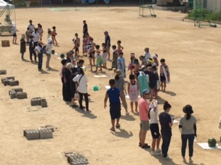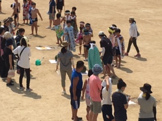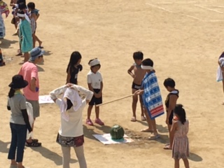 もっと左!まっすぐ!応援の声が飛び交います。見事に割れたスイカはお母さんたちの手で切り分けられます。