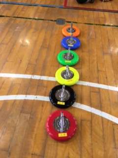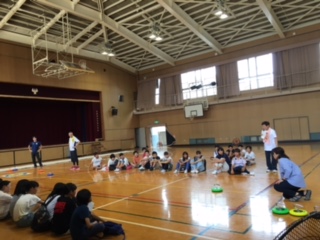 続いて体育館でカローリング大会です。説明の後、先生対同窓会役員チームのデモンストレーション試合を行いました。