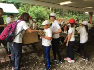 朝早く出発したので、お腹がすいてきました。食事係さんがお弁当を配り、みんなでいただきまーす!