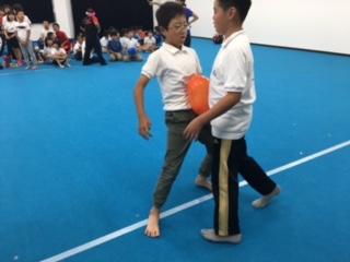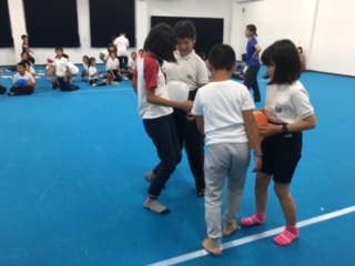 次は、2人で協力して風船を運ぶリレーです。お腹で、肩でと工夫して運んでいます。