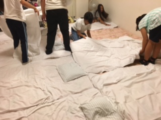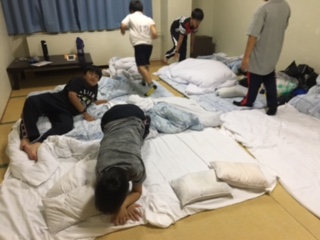 入浴タイムです。待っている組は、布団を敷いたり明日の準備をしたりしています。