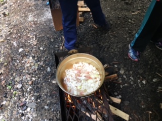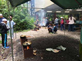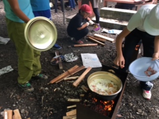グループによって時間差があります。かまどの作り方、野菜の切り方、水の量などなど。待っている班、もう食べている班などいろいろです。