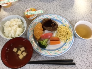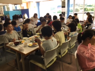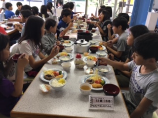 今夜の夕食は、ハンバーグです。この後のキャンプファイヤーに備えてしっかり食べます!!
