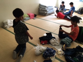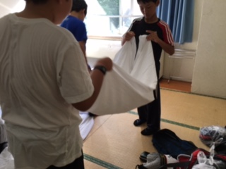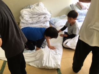 食事の後は、部屋の片付けです。普段家では布団のカバーをかけたりシーツをたたんだりといったことはあまりしていないかもしれません。手間取っているときは、友達と協力してやると早くきれいにできますね。