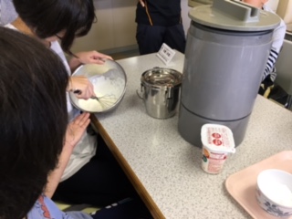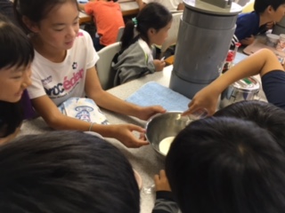 ていねいな説明を聞いたあと、生クリームを泡立てていきます。固くなるまでなかなか大変です!