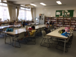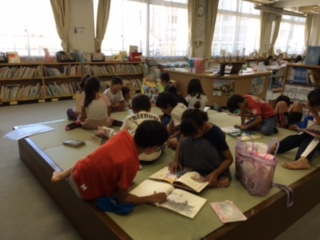プール開放の前に本を読みに来ている子がいます。読書感想文や自由研究の参考図書を探して読んでいました。
