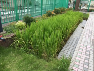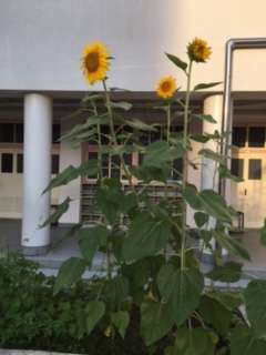 1年生の教室前にヒマワリが大きな花を咲かせています。