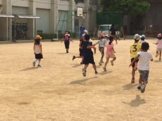 説明を聞いた後、鬼ごっこやじゃんけんゲームなどで、楽しみながら、走ったり、素早く立ったり座ったりする動きを体感しました。