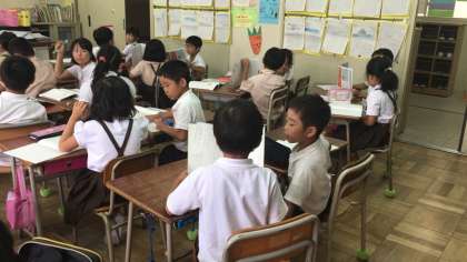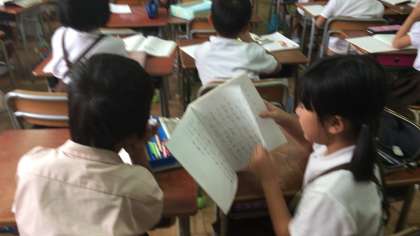 「宝物を紹介しよう」の学習です。何をどんなふうに紹介したらよいか、学習し、ノートに発表メモを書きました。隣どうしで、聞き合い、質問などをし、付け足すところやわかりにくいところなどを教えあっています。子ども達の宝物は、一人一人の思いがあって、いろいろなものの名前が挙がっています。